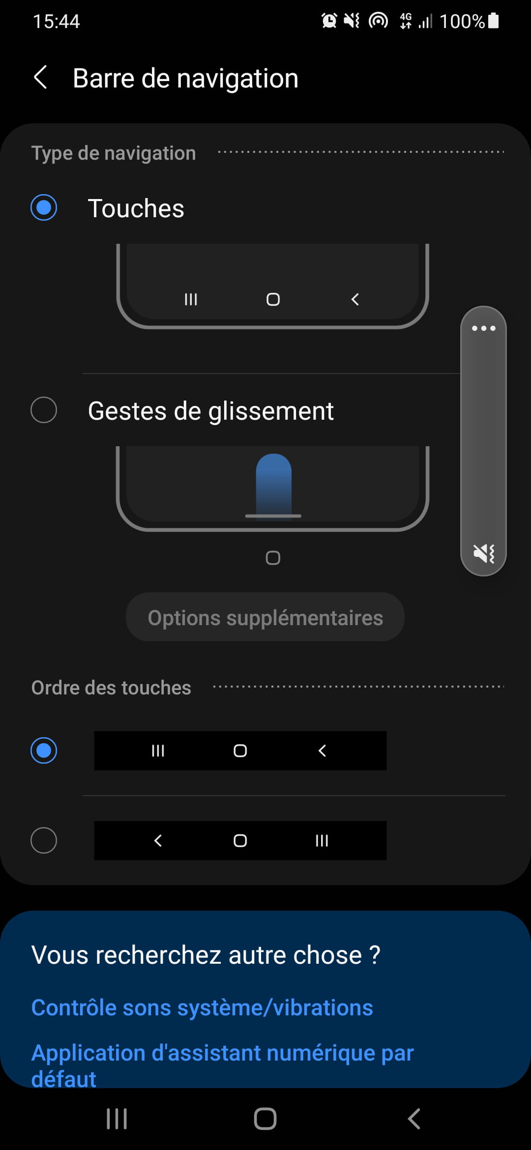 2 Quand l’option « Touches » est sélectionnée, allez en bas de l’écran en déroulant la page. Dans le menu « Ordre des touches », sélectionnez le type de barre de navigation que vous préférez.