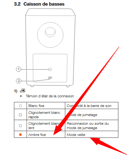 Si le voyant orange reste allumé et qu'aucun son ne sort de ta barre de son JBL Cinema SB120, vérifie d'abord la connexion électrique et le volume. Assure-toi que le caisson de basses est bien appairé à la barre de son, le voyant doit être fixe et vert.