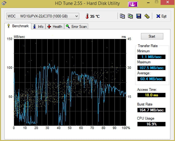 Donc tu télécharges HD_tune ici "https://www.hdtune.com/files/hdtune_255.exe" et l'installe sur ton PC... Tu lances les tests "Benchmarck... Health... Error Scan" l'un après l'autre, fait une capture de chaque fenêtre...l'icone de la disquette est là pour ça... et tu postes ces images sur le site "https://www.catupload.com/" sans oublier de coller le lien de chacune ici..