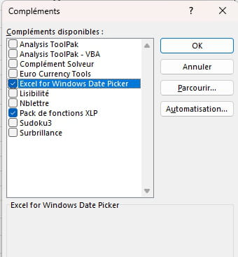 En bas de la boîte de dialogue, en face de "Gérer", choisis "Compléments Excel". Clique sur "Atteindre". La fenêtre s'ouvre avec la liste des compléments :