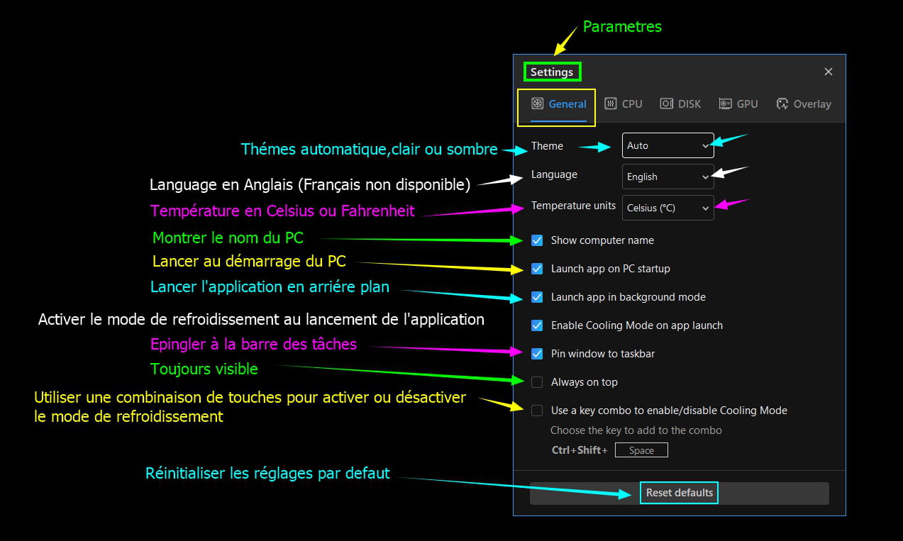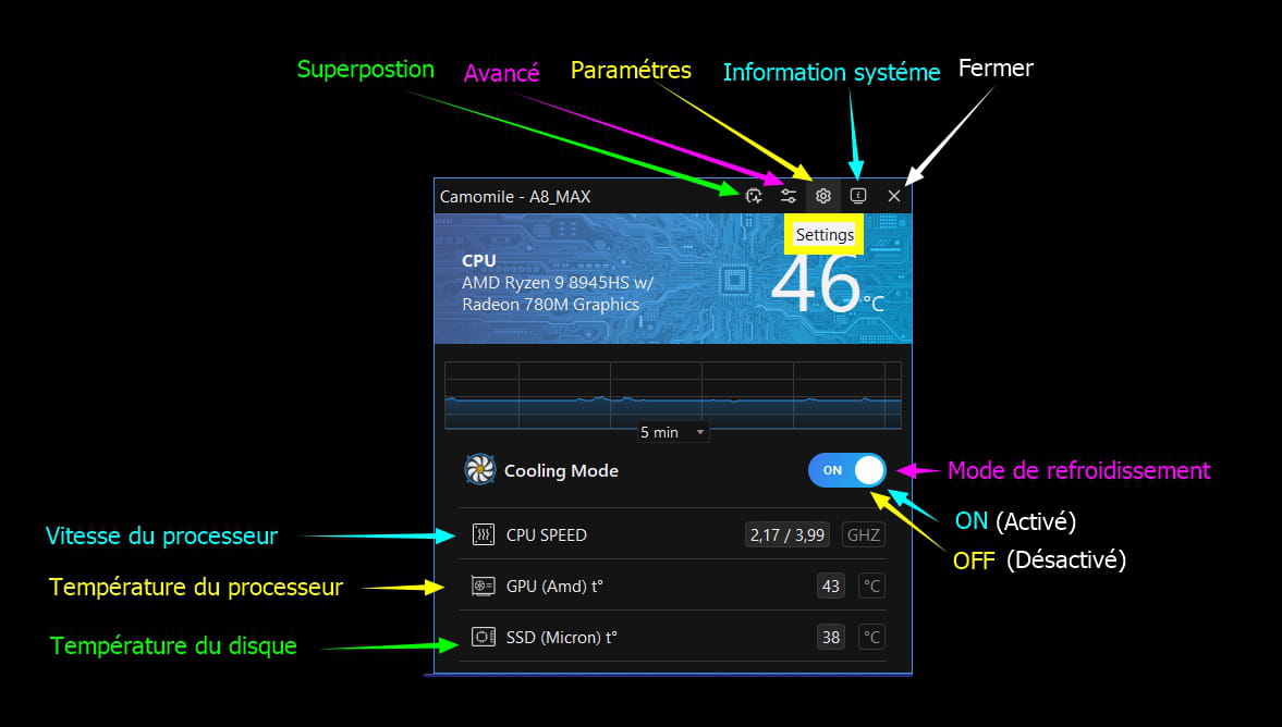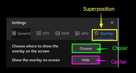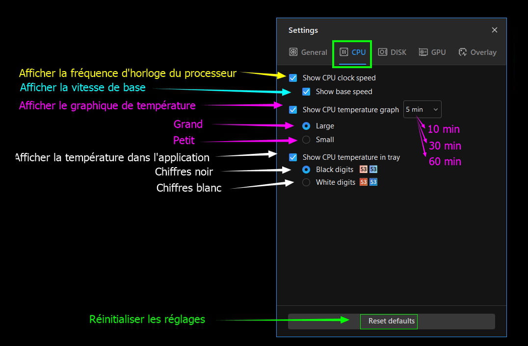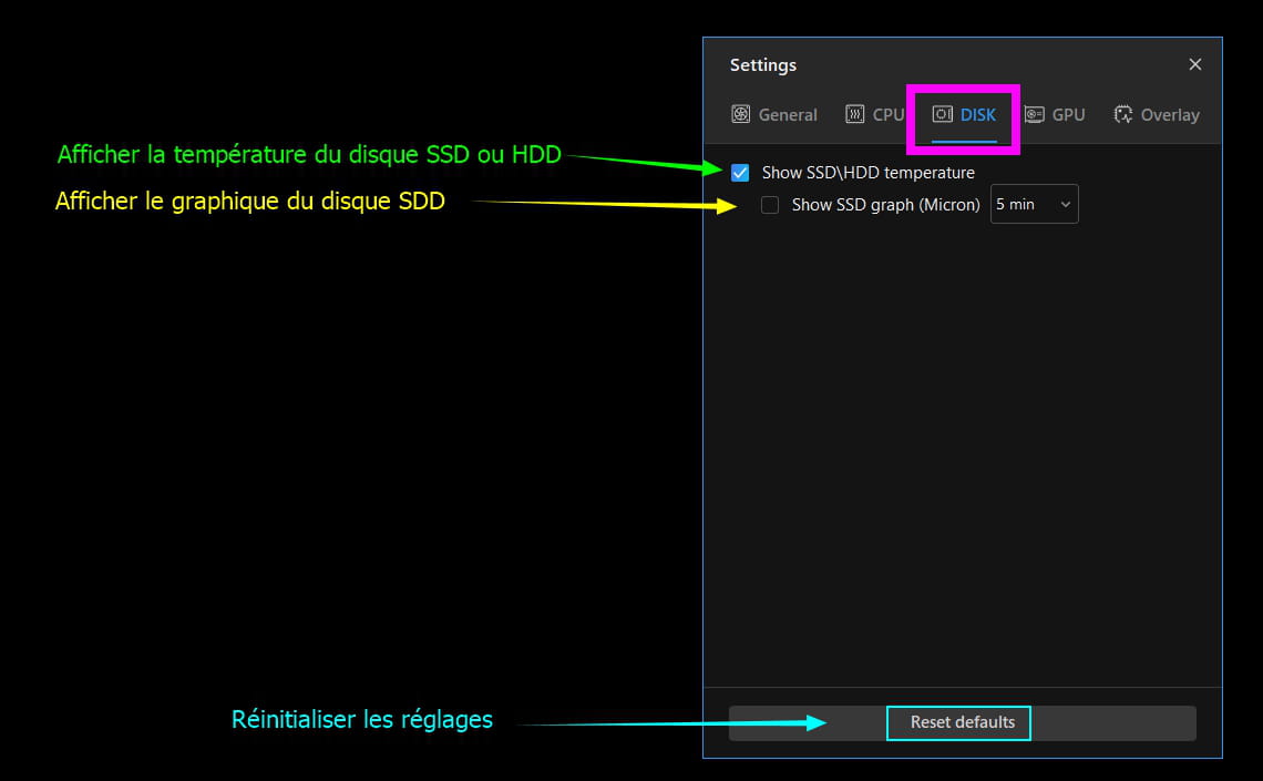 Permet d'afficher d'un coup d’œil le FPS (nombre d'images par secondes) ainsi que les températures du processeur.