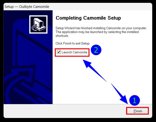 Laisser les 2 case cochées afin de créer un raccourci sur le Bureau et lancer Camomille au démarrage du PC.