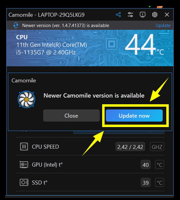 Une autre solution sans ouvrir Camomile est de constater un très fort ralentissement,parfois et même souvent le PC émet un bruit du ventilateur ,il faut alors vérifier si ''Update'' est affiché dans l'interface ce qui sera vraisemblablement le cas.