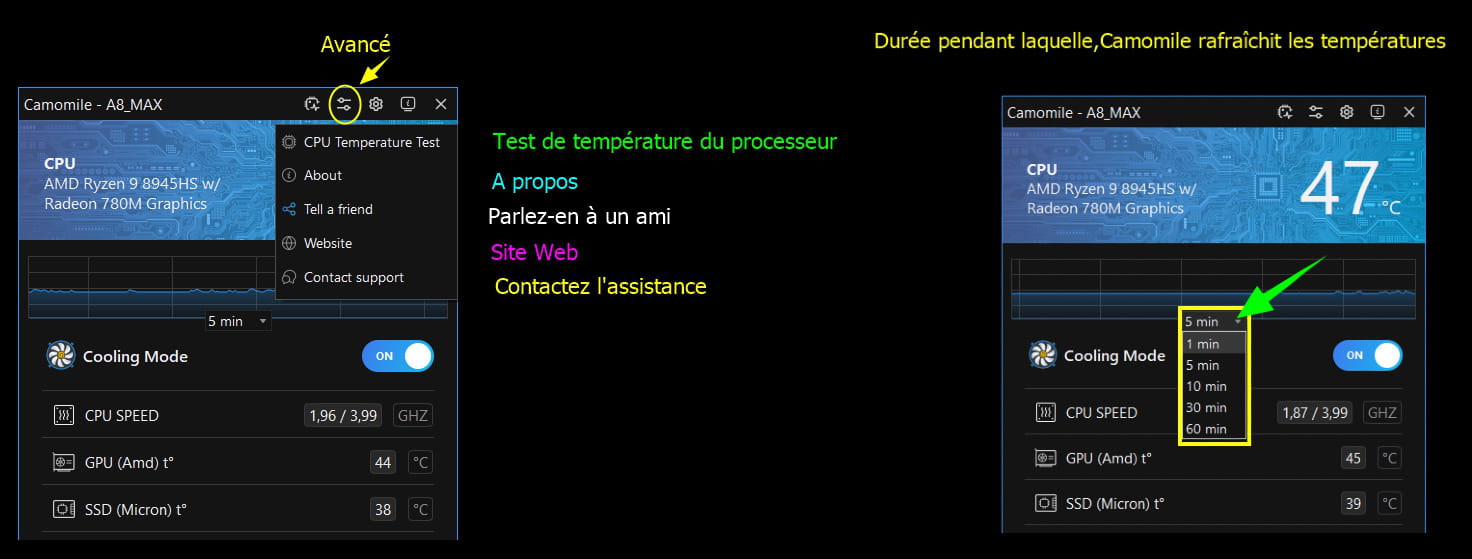 Activer sur ''ON'' le cooling Mode afin de réduire le bruit du PC et l'autonomie de la batterie sur PC portable.