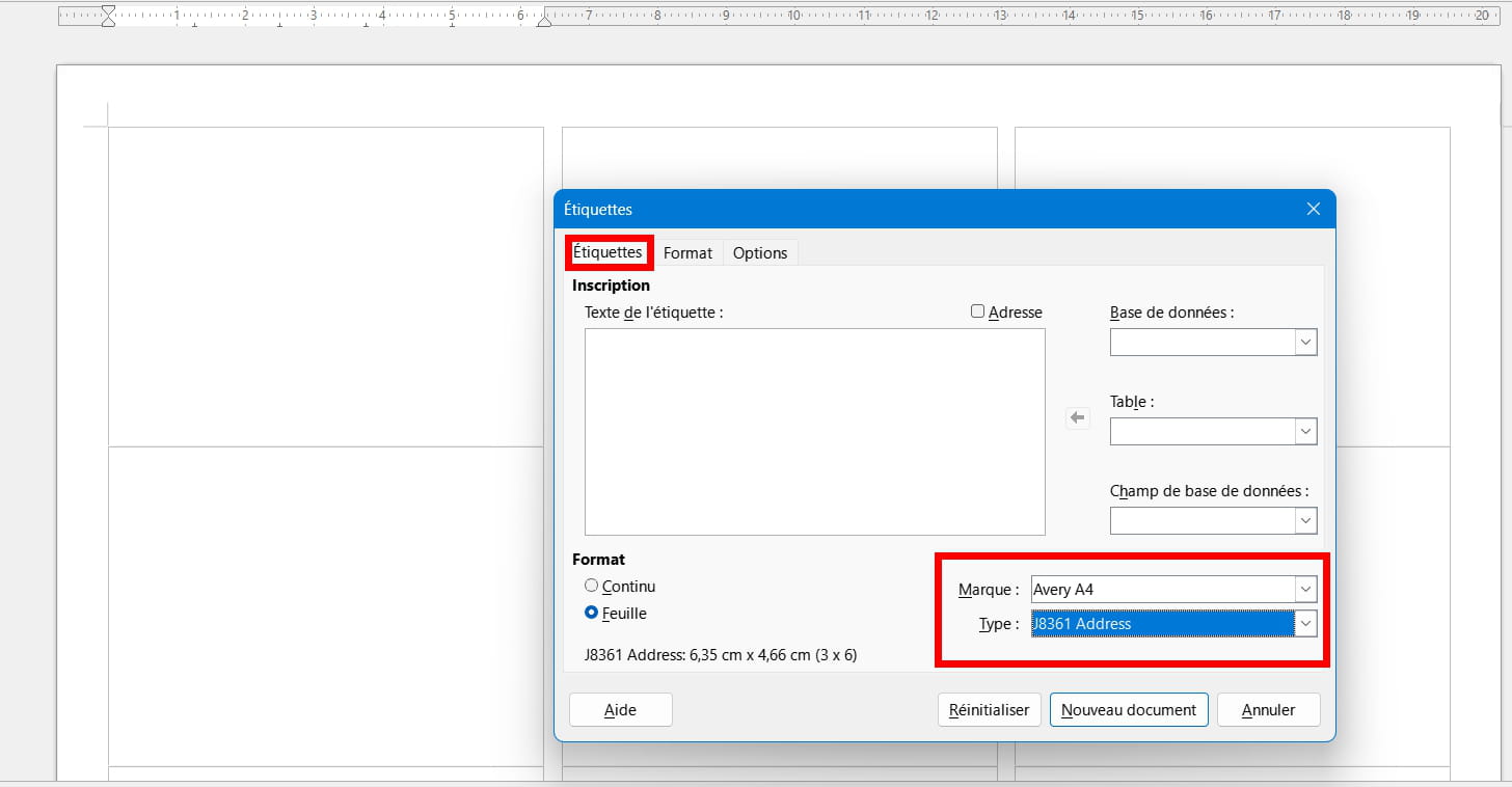 Mais ce n'est pas une obligation. Vous pouvez très bien faire le paramétrage vous-même en utilisant les dimensions indiquées dans le paquet d'étiquettes (taille de l'étiquette, espacement, distance avec le bord de la feuille).