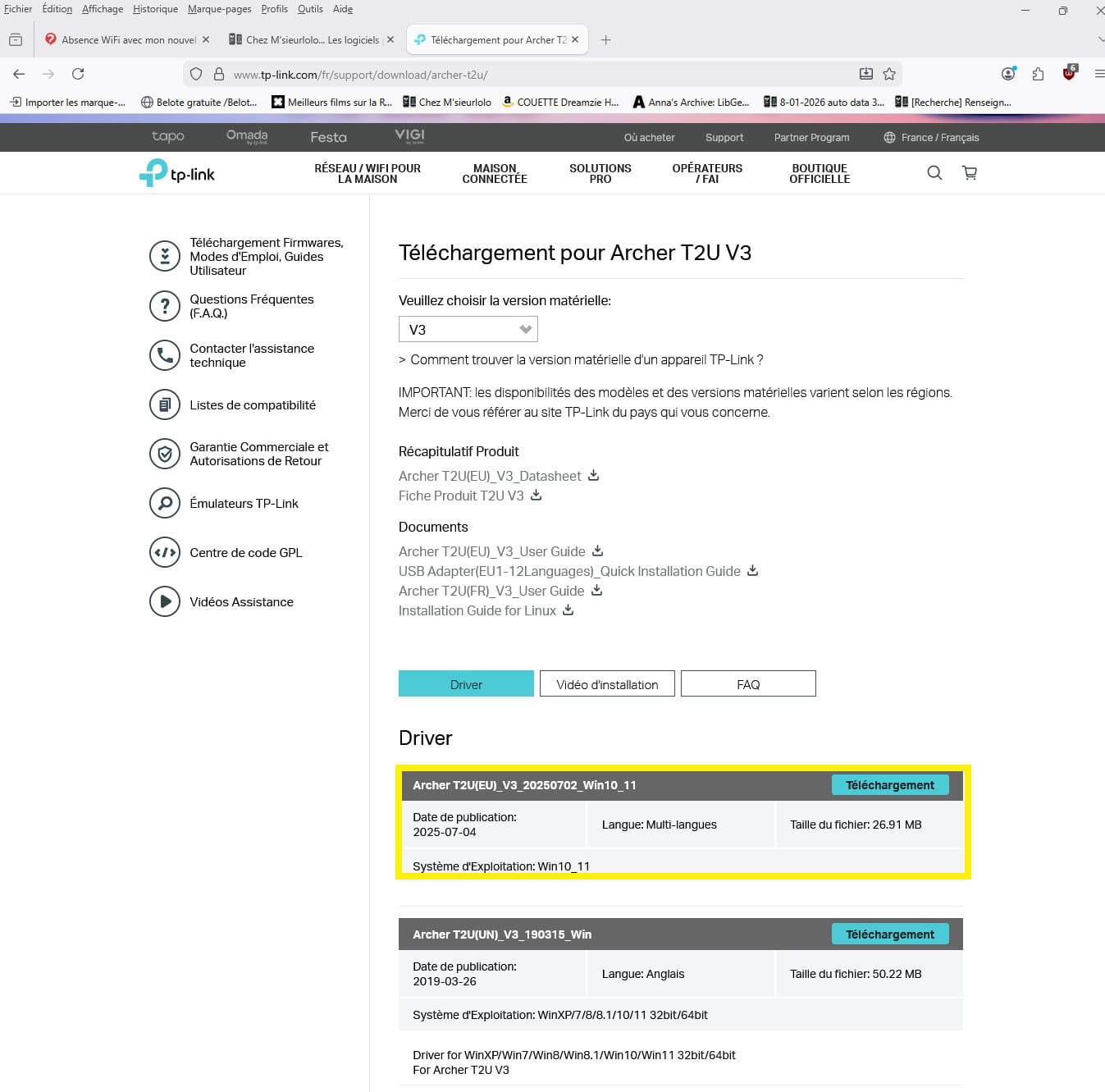 Fichier zip téléchargé et à installer : Archer_T2U(EU)_V3_20250702_Win10_11