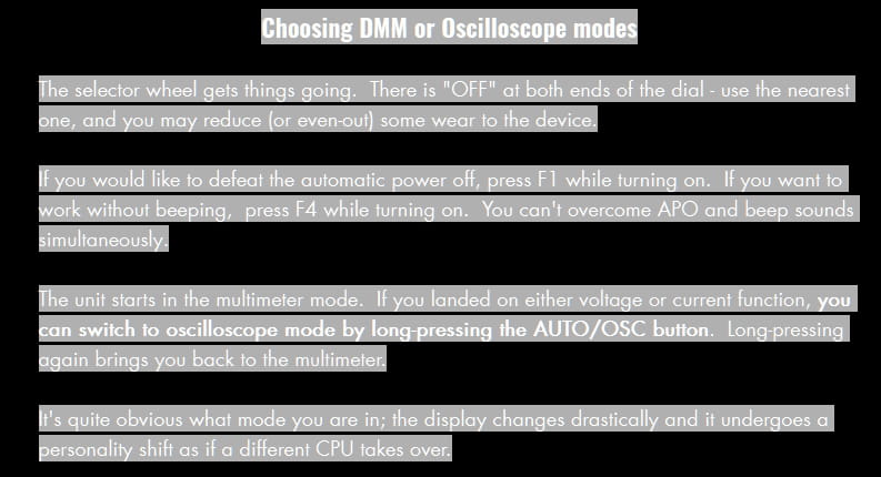 Sélection du mode multimètre ou oscilloscope La molette de sélection permet de démarrer l'appareil. La position « OFF » se trouve aux deux extrémités de la molette ; utilisez la position la plus proche pour réduire (ou uniformiser) l'usure de l'appareil. Pour désactiver l'arrêt automatique, appuyez sur F1 lors de la mise sous tension. Pour travailler sans le signal sonore, appuyez sur F4 lors de la mise sous tension. Il est impossible de désactiver simultanément l'arrêt automatique et le signal sonore. L'appareil démarre en mode multimètre. Si vous êtes en mode tension ou courant, vous pouvez passer en mode oscilloscope en maintenant le bouton AUTO/OSC enfoncé. Un nouvel appui long vous ramène au mode multimètre. Le mode actif est facilement identifiable : l'affichage change radicalement et l'interface se comporte comme si un autre processeur prenait le relais.