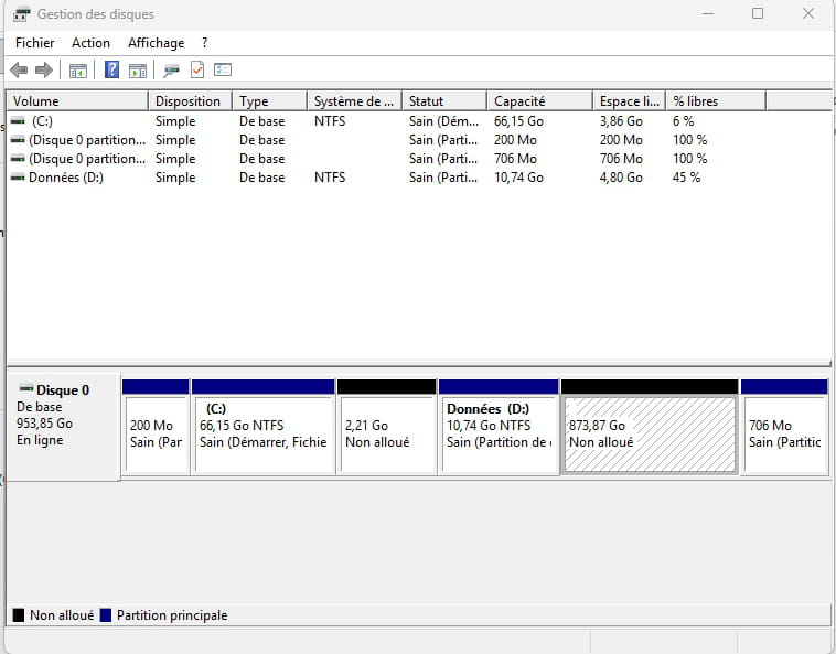-Fusionner de la même manière les 873 Go non alloués avec D: