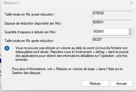 Tu ne peux sans doute pas réduire ta partition système à 64 Go parce qu'elle occupe plus d'espace ou a de toute façon besoin d'une certaine quantité d'espace libre, et même si tu pouvais ce n'est pas une bonne idée, une bonne valeur est comme je l'ai dit autour de 100-120 Go (soit 122880 Mo après réduction dans le dernier cas).