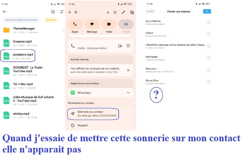 Par contre quand je vais dans "contacts", que je choisis le contact concerné et que je cherche à changer la sonnerie, elle n'apparaît plus.
