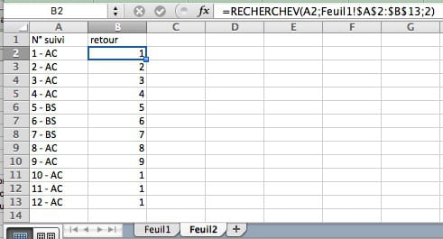 Sur ma feuille 2 j'essaye de faire afficher le retour en fonction du numéro de suivi