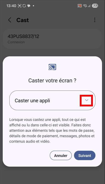Dans l'écran suivant, cliquez sur le chevron et choisissez "Caster l'écran". Puis cliquez sur "Suivant".