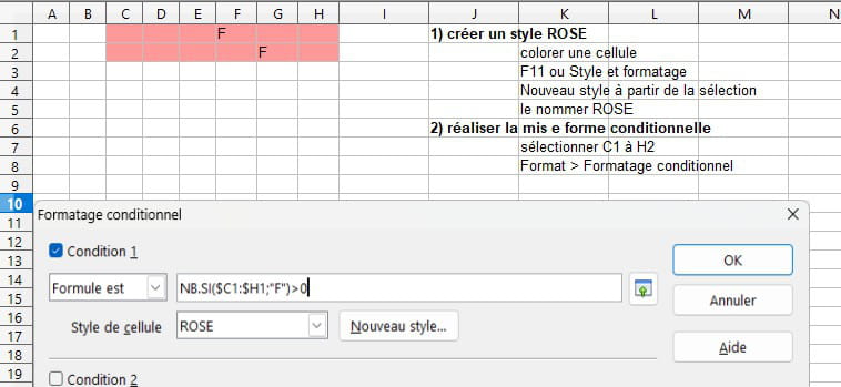 ligne 2 - c2,d2,e2,f2,g2,h2 si F dans g2 cellule c2,d2,e2 f2,g2,h2 colorié en rose