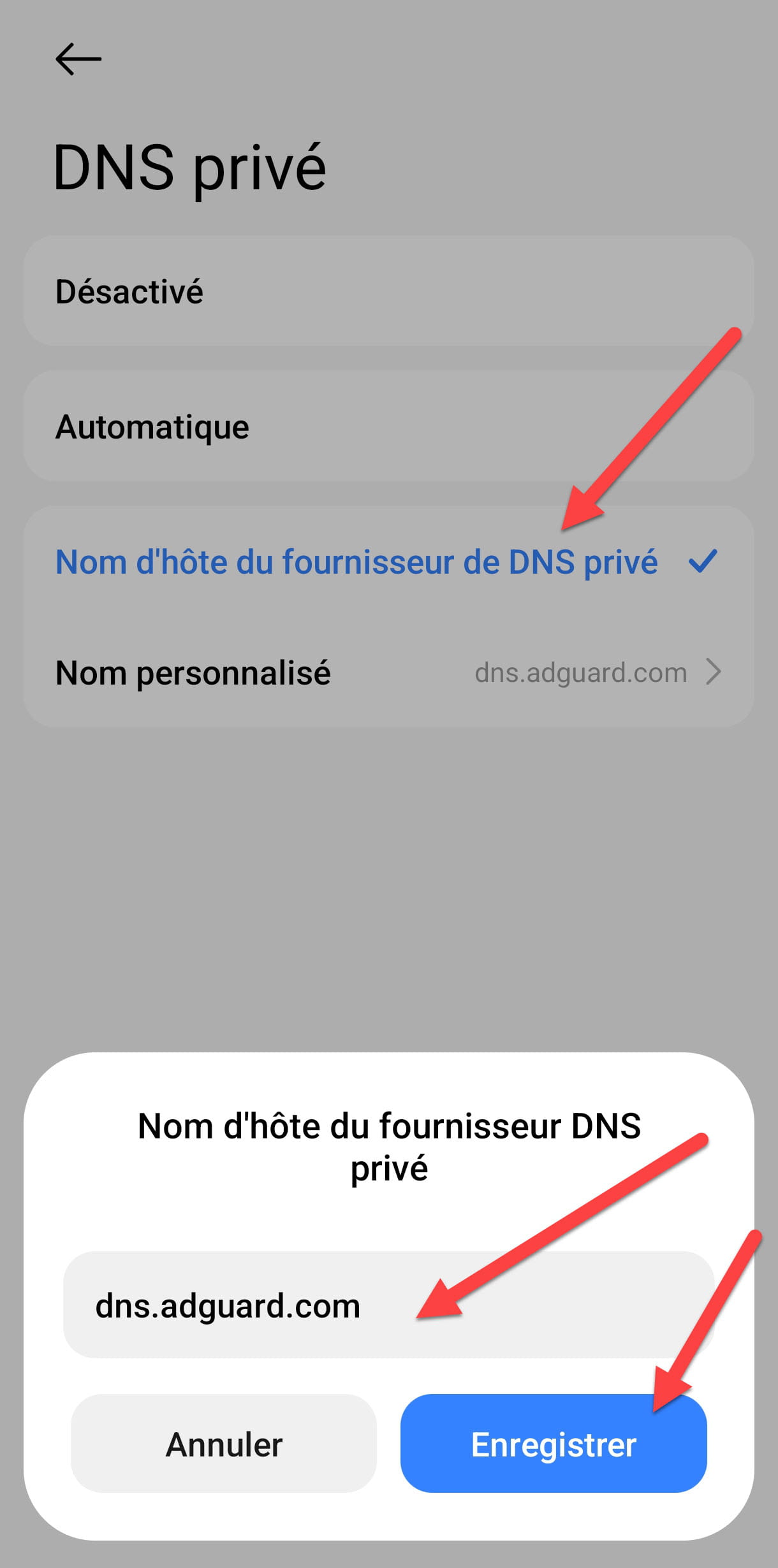 Une fois dans le menu des DNS privés vous vous apercevez qu'ils sont en automatique, il faut alors cliquer sur Nom de l'hôte du fournisseur de DNS privé pour ma part j'en ai testé plusieurs et celui qui m'a donné le plus satisfaction c'est le DNS d'Adguard, vous mettez donc dns.adguard.com puis vous enregistrez les modifications, voir ci-dessous.