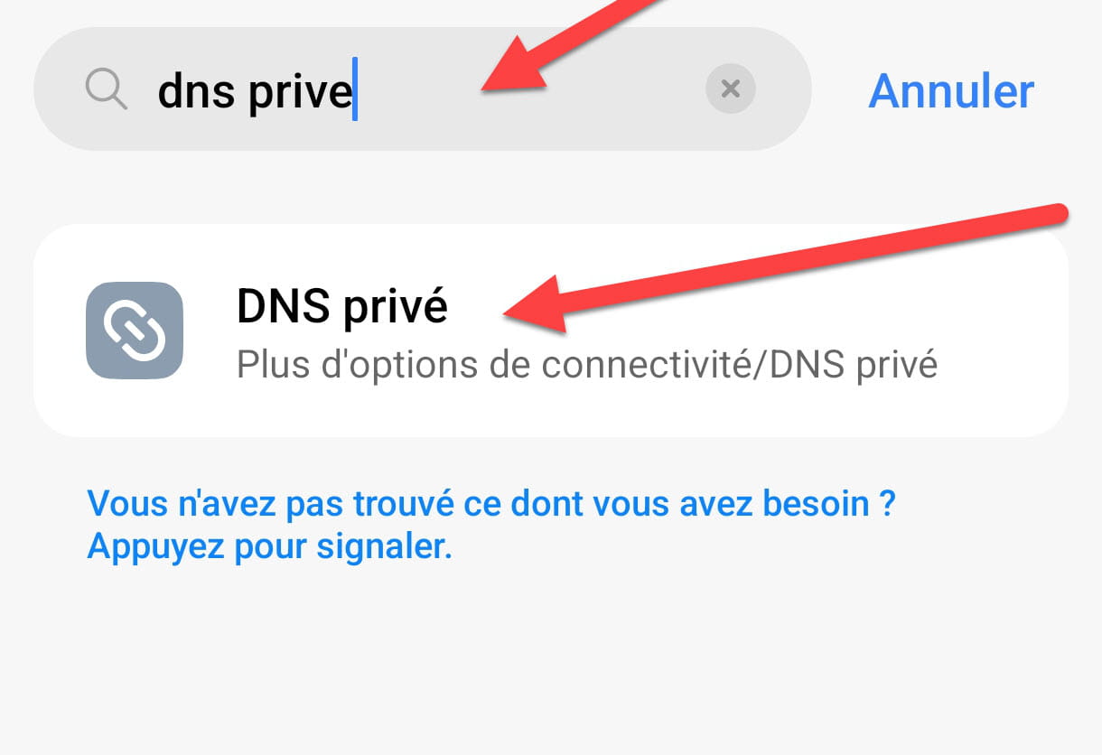 Aller dans les paramètres de votre téléphone ou tablette sous Android, dans le champ de recherche tapez DNS privé puis allez dans le menu des DNS privés, voir ci-dessous.