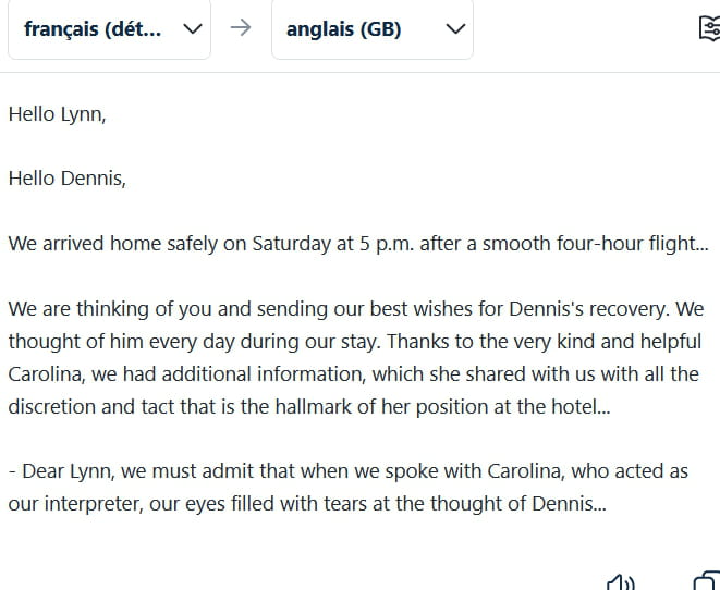 Nous pensons bien à vous et avons formé des vœux pour l'amélioration de l'état de santé de Dennis à qui nous avons pensé chaque jour durant notre séjour. Nous avions bien sûr, grâce à la très gentille et très disponible Carolina, des informations complémentaires qu'elle nous communiquait avec toute la réserve et la discrétion qui est la marque de sa fonction au sein de l'hôtel...