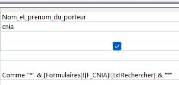 Bonjour, mon formulaire Access à comme source une requête, j'ai dans ma table un champ nommé "nom et prenom". A travers une zone de texte "TxtRechercher", j'arrive à filtrer mes enregistrements soit par le nom ou le prénom mais jamais les 02 ensembles, comment puis-je procéder ? L'évènement de la zone de texte est sur "Après changement" [Macro incorporée]