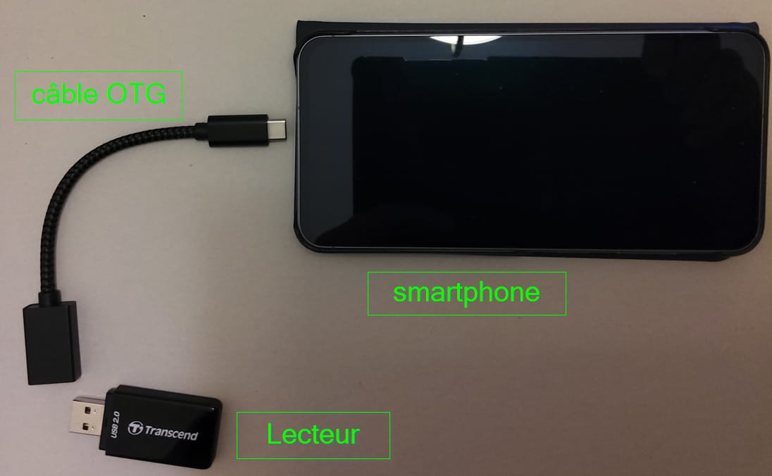 Pouvez-vous me donner la référence de ce lecteur et m'indiquer comment vous le connectez au smartphone. Est-ce une connexion directe sur le port USB ou utilisez-vous un câble OTG pour faire la liaison ?
