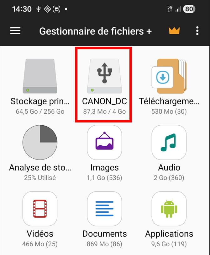Vous voyez une icône avec le symbole des connexions USB. (L'indication Canon vient du fait que j'ai utilisé la carte SD d'un appareil de photo Canon ; il ne faut pas en tenir compte.)