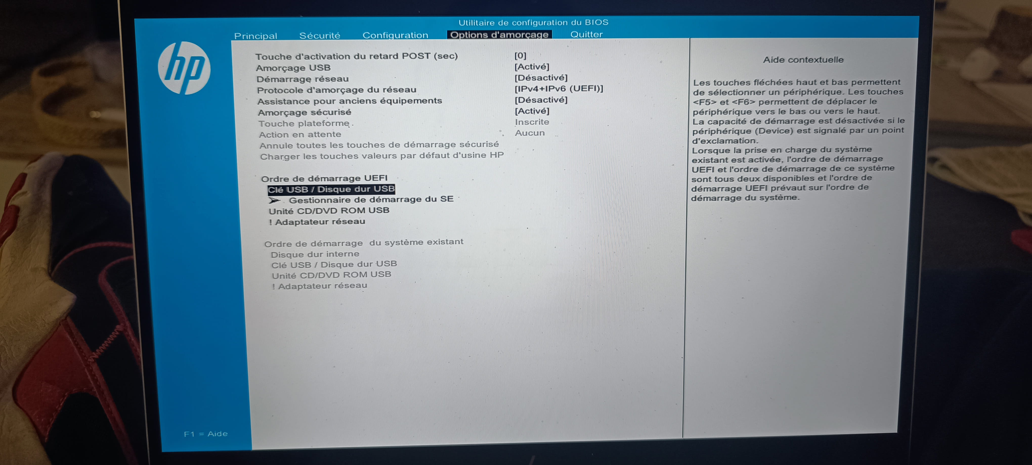 Ensuite pour démarrer sur la clé pour voir ou vérifier le disque, c'est peut être Echap, F10 ou proche pour atteindre le BIOS