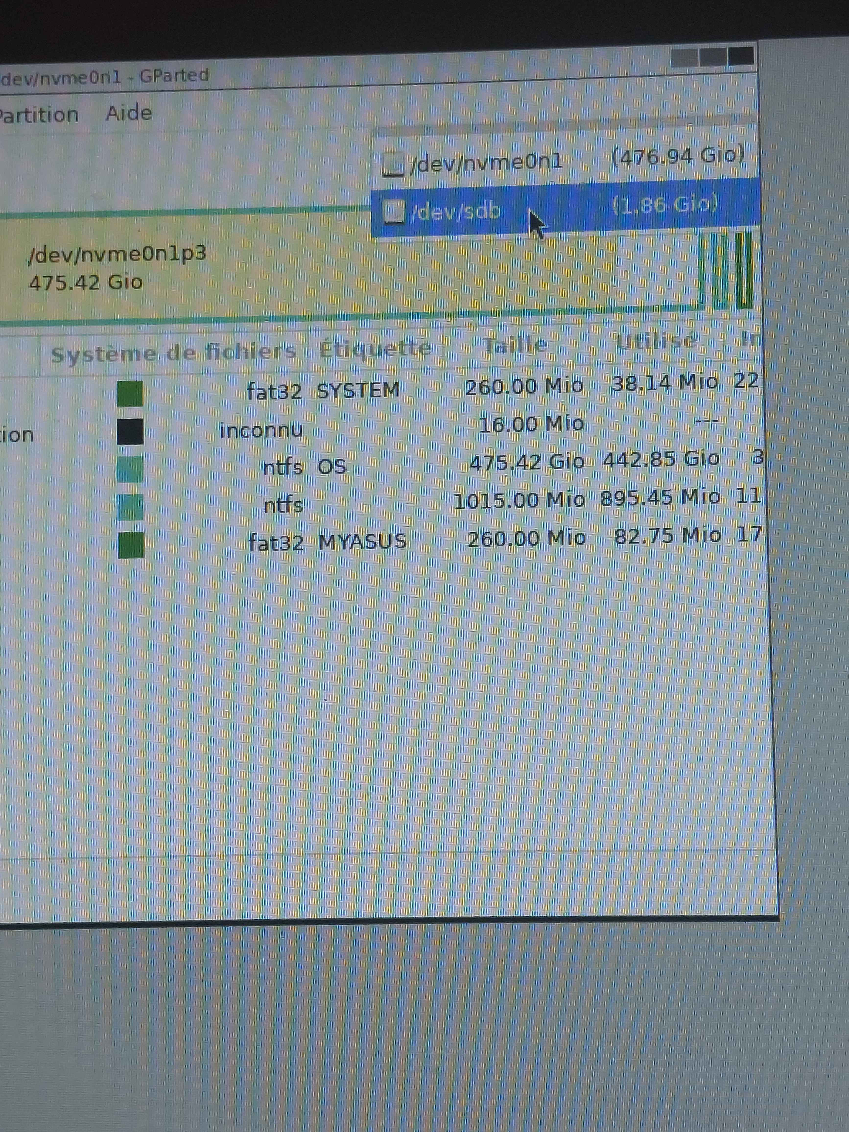 Par contre, j'observe que dans la liste des 2 disques, c'est nvme0n1 (le SSD) qui apparait et aussi Sdb qui est l'USB de Gparted...