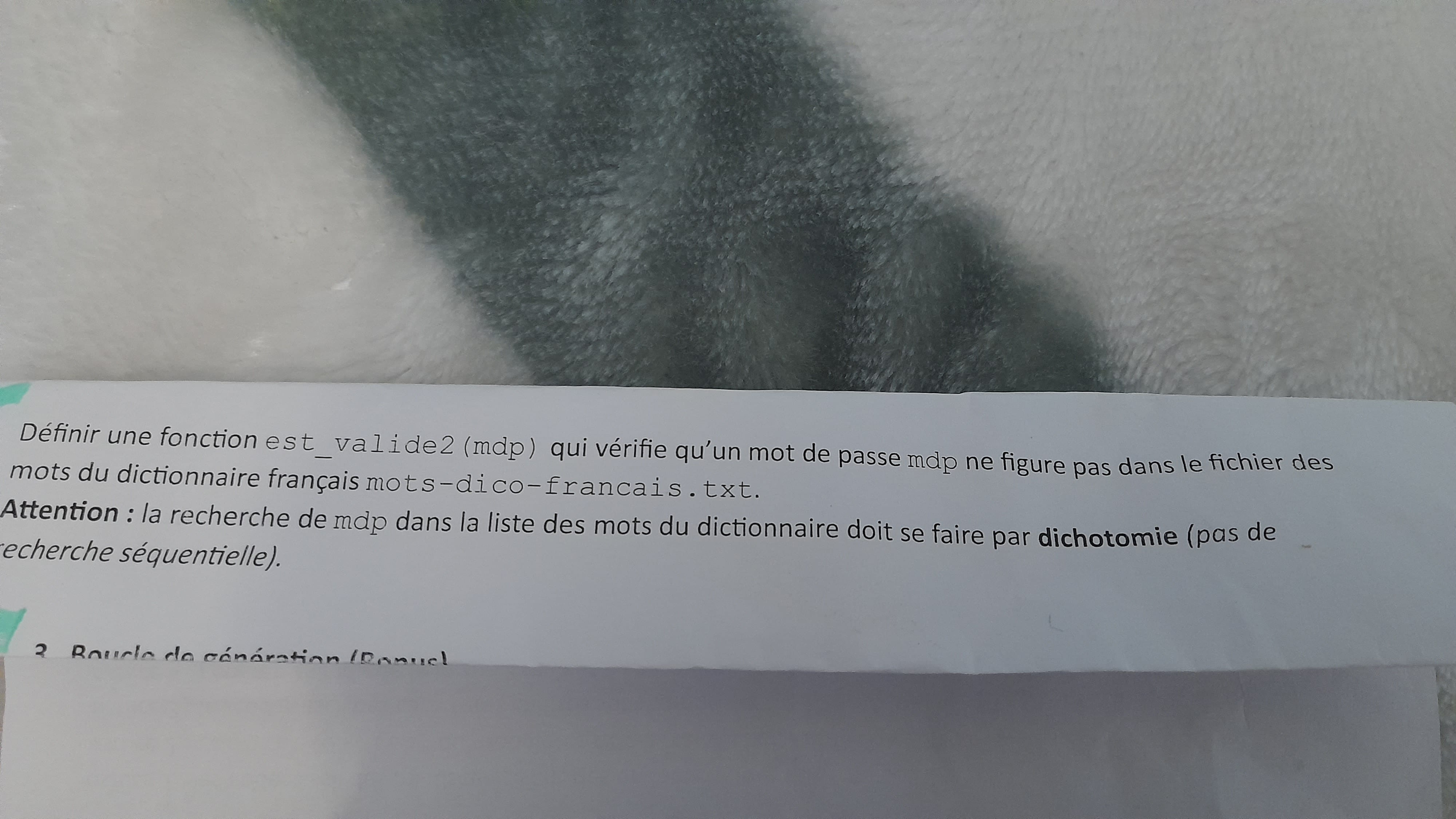 C'est ce qu'on écrirait en pratique. Mais ça n'est toujours pas ce que veux ton enseignant, qui souhaite une solution plus compliquée à écrire, moins performantes (car en O(log(n)) et qui présuppose que la liste de mot est triée.