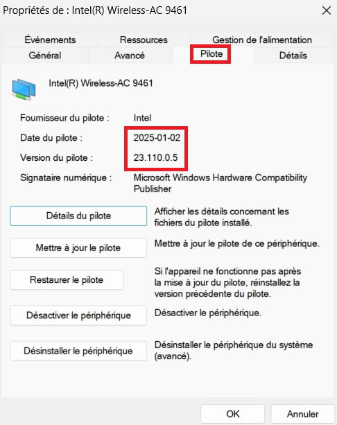 Actuellement, c'est quoi la date et la version du pilote ?