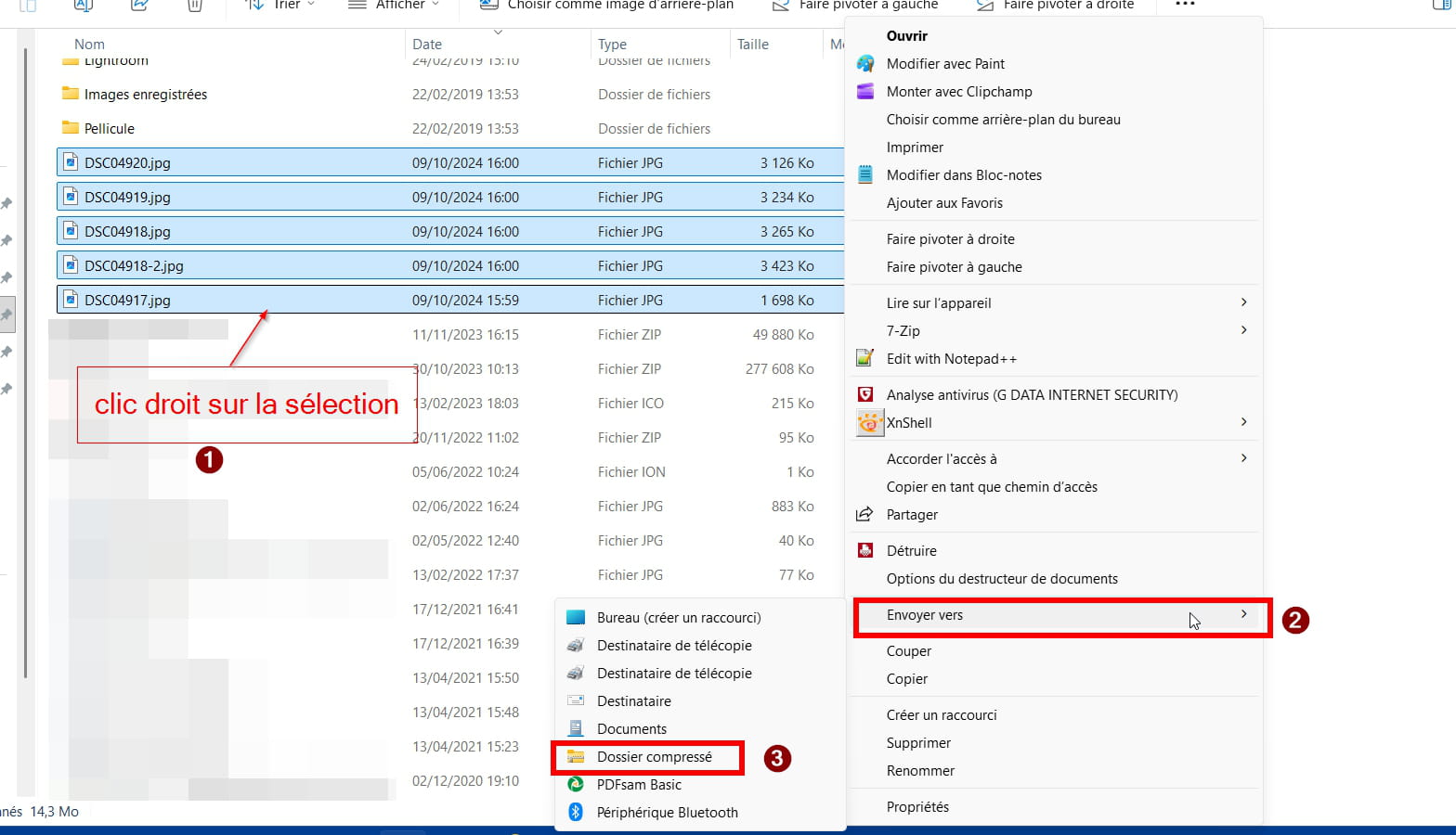 Commencez par sélectionner les photos ou les éléments que vous voulez mettre dans l'archive. Ensuite faites un clic droit sur la sélection et choisissez Envoyer vers > Dossier compressé