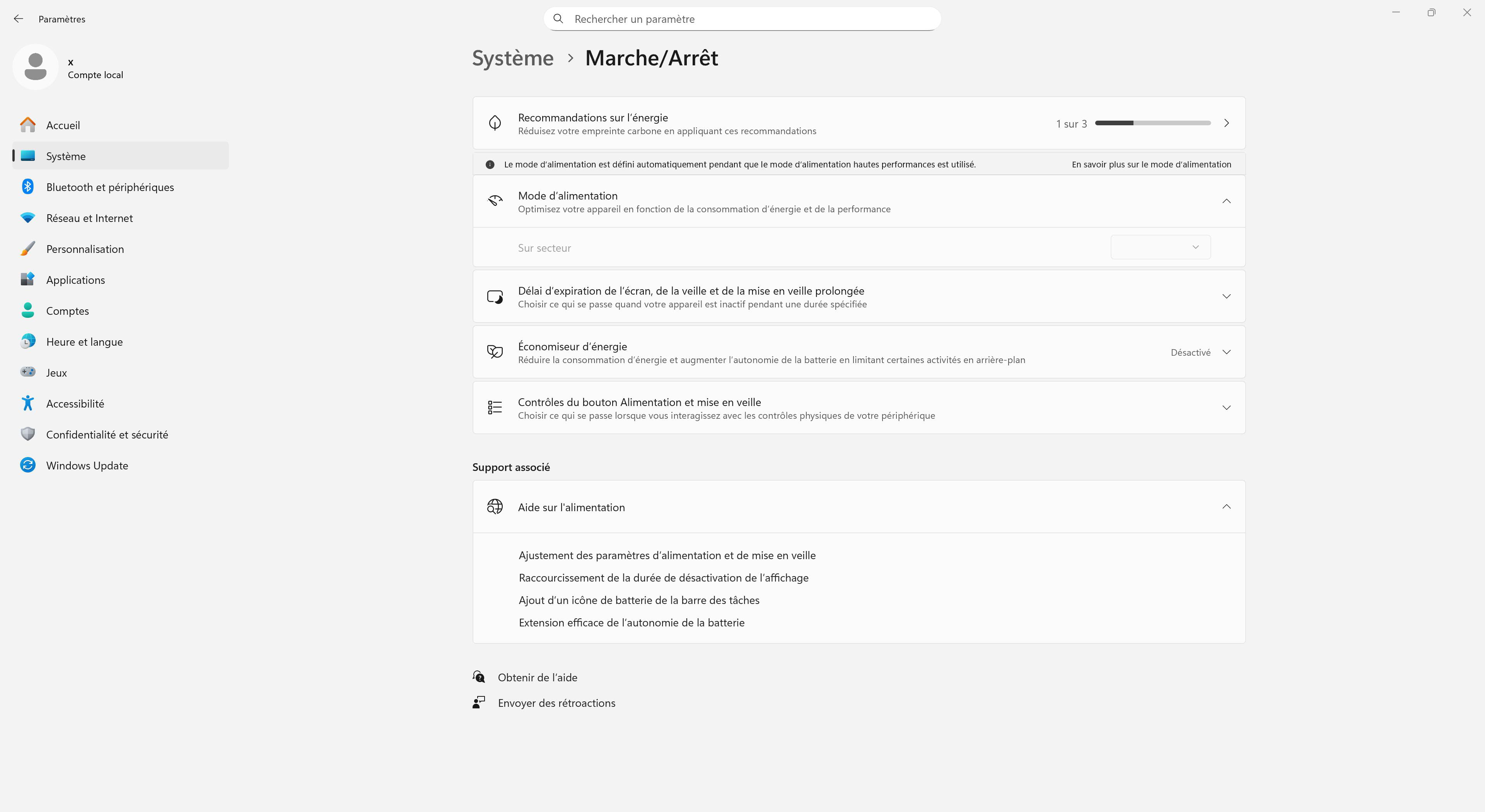 Vu ce que j'ai ici: Le Mode d,alimentation est défini automatiquement pendant que le mode d'alimentation Haute Performances est utilisé.