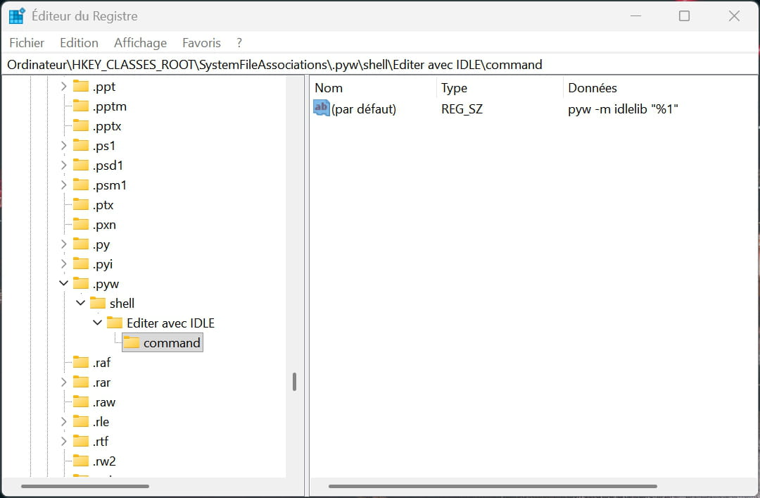 Ensuite Créé commande qui doit avoir comme valeur pyw -m idlelib "%1"