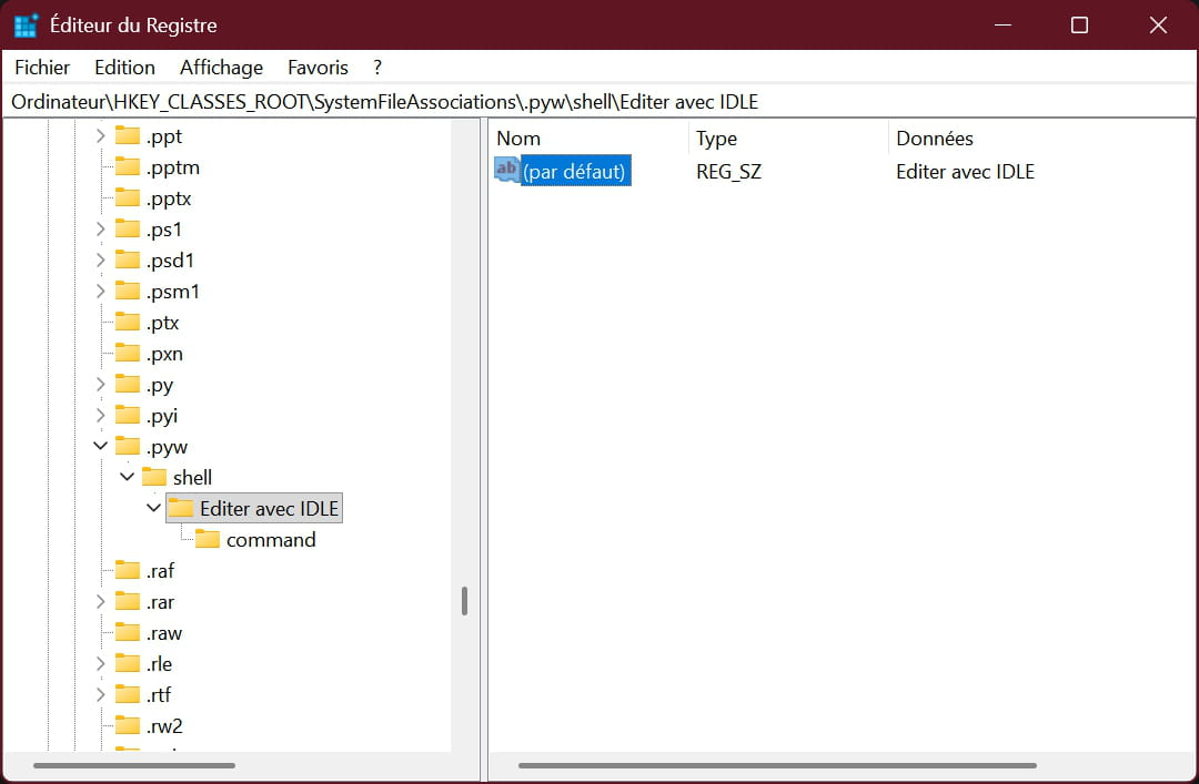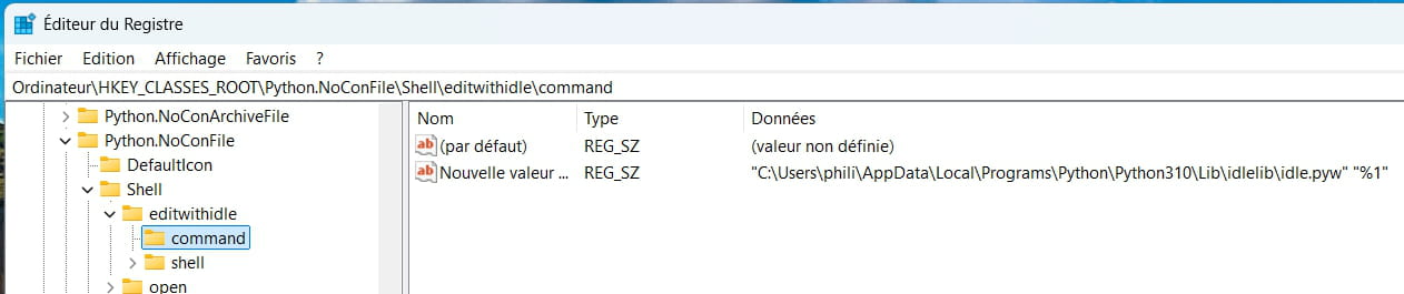 1️⃣ Ouvrir l’éditeur du registre Win + R regedit 2️⃣ Aller dans la clé HKEY_CLASSES_ROOT\Python.NoConFile\shell 3️⃣ Créer une nouvelle clé Nom : Edit with IDLE Puis à l’intérieur créer la clé : command 4️⃣ Valeur de command Mettre par exemple : "C:\Users\TON_USER\AppData\Local\Programs\Python\Python310\Lib\idlelib\idle.pyw" "%1" (adapte le chemin selon ta version de Python)