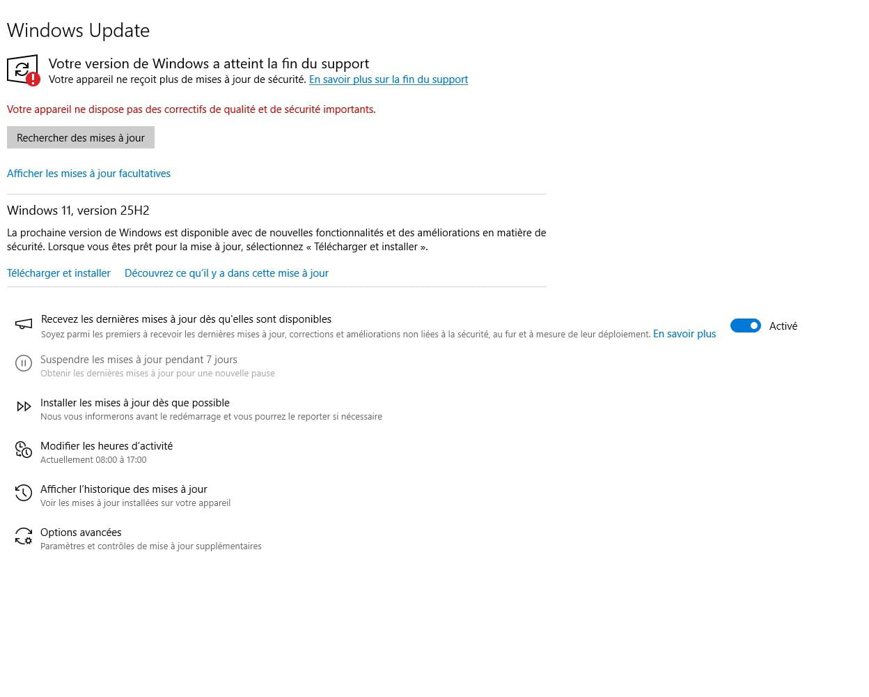 Octobre 2025 est la fin de la prise en charge des mises à jour de sécurité Windows 10, octobre 2026 la même chose si on a souscrit au programme ESU lui aussi gratuit pour les particuliers de un an.
