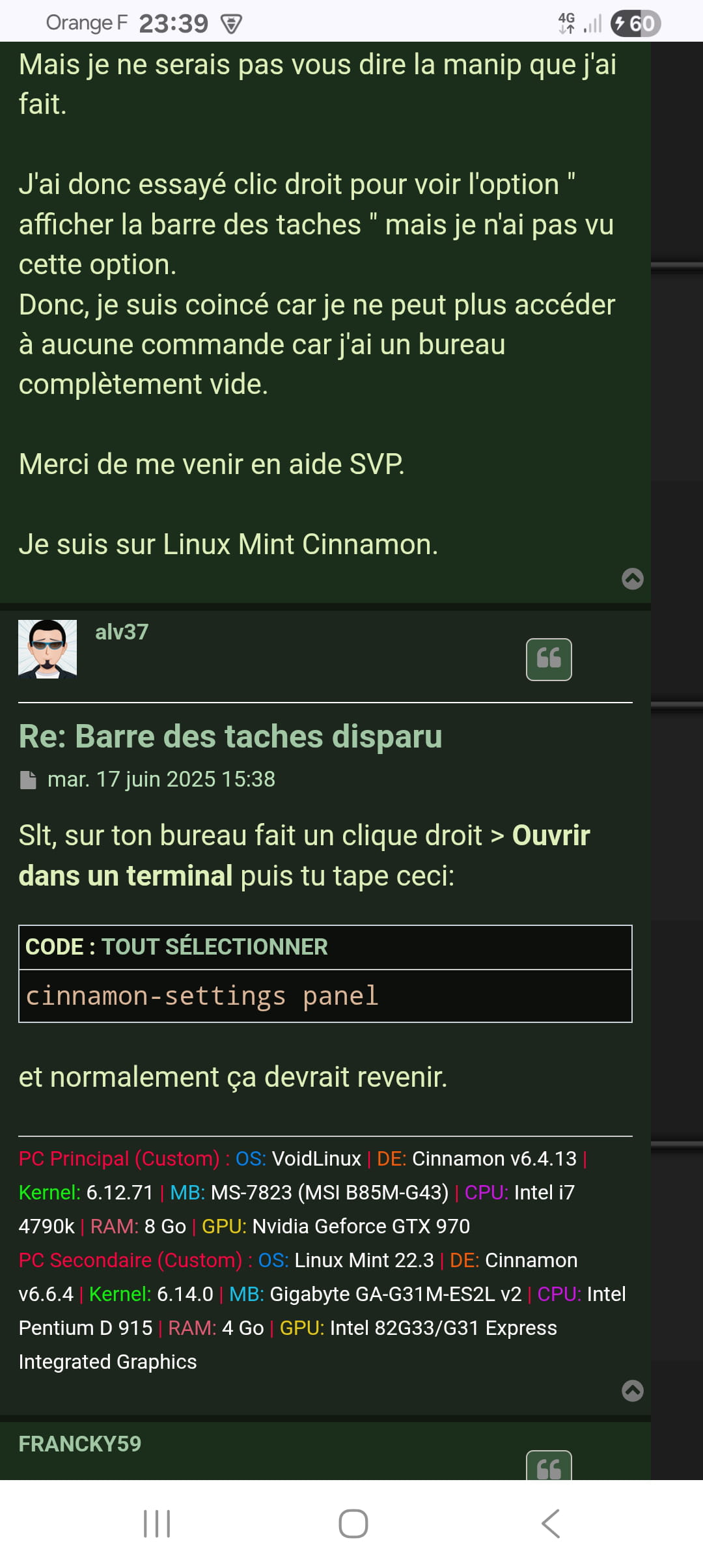 Je viens d'acquérir un pc sous Linux mint et suite à une mauvaise manipulation je n'ai plus de barre des tâches. Pouvez-vous m'aider s'il vous plaît ?