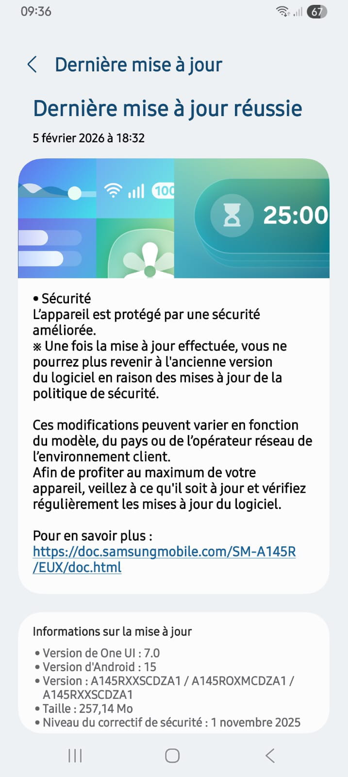 Ce message concerne le téléphone portable de maman (un Samsung Galaxy A14 - A145R/DSN) One UI 7 et Android 15.