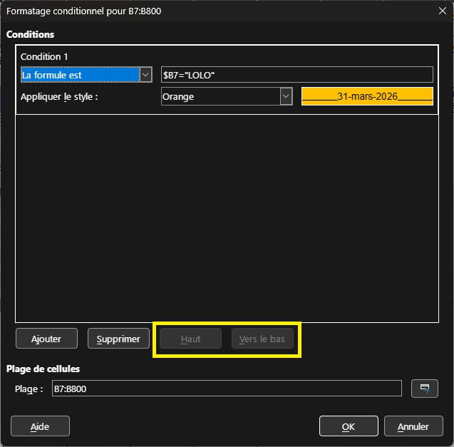 Dans le gestionnaire des formats conditionnels pour une même plage de cellules contenant diverses conditions de format les boutons "haut" "bas" sont inactifs.