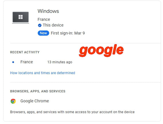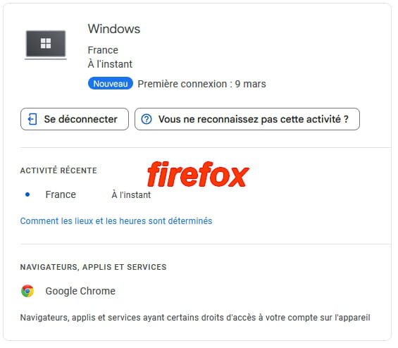 Dans cet autre navigateur, cliquer sur Gérer ton compte Google, puis dans la fenêtre affichée, cliquer sur le bouton Appareils : les sessions de connexion apparaissent. Tu peux alors te déconnecter de la session lancée sur ton navigateur d'origine.