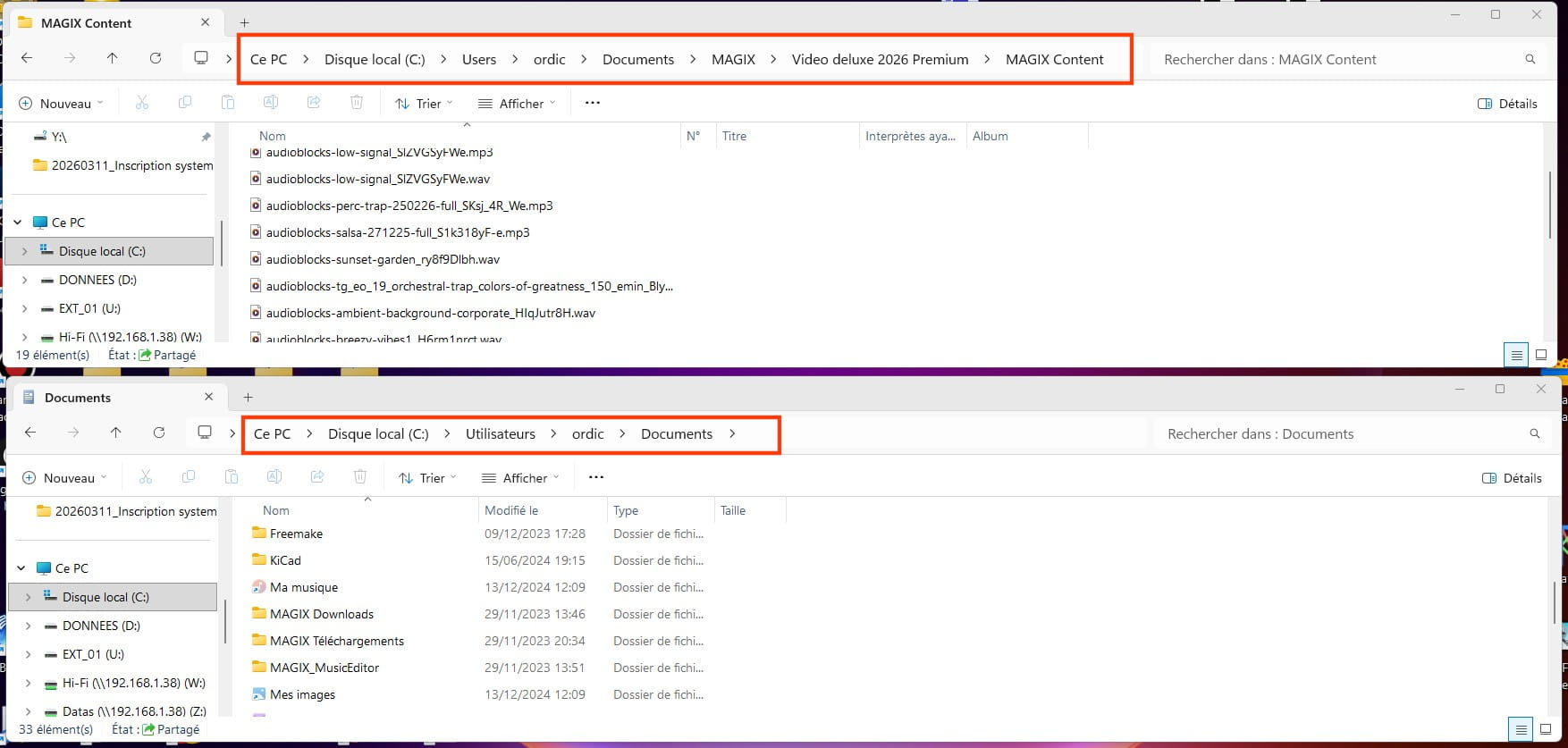 J'ai déjà vu sur internet des images de windows 10 par exemple installées dans des pc neufs qui ne reprenaient pas les mêmes noms de dossiers que les images téléchargées sur le site microsoft. Et l'explorateur présentait des traductions, donc pas le même "cheminement" dans les menus ou l'explorateur et sur le "disque dur" et c'est la plainte de l'auteur. Il a pu télécharger sur son pc on le voit sur le site, donc il peut retrouver sur ses disques les noms des différents dossiers depuis la racine qui ne sont pas ceux indiqués par C:Users\Utilisateur\Documents\MAGIX\Video deluxe 2026 mais peut-être C:AllUsers\ordic\... quand l'explorateur affiche C:Utilisateurs\ordic\...