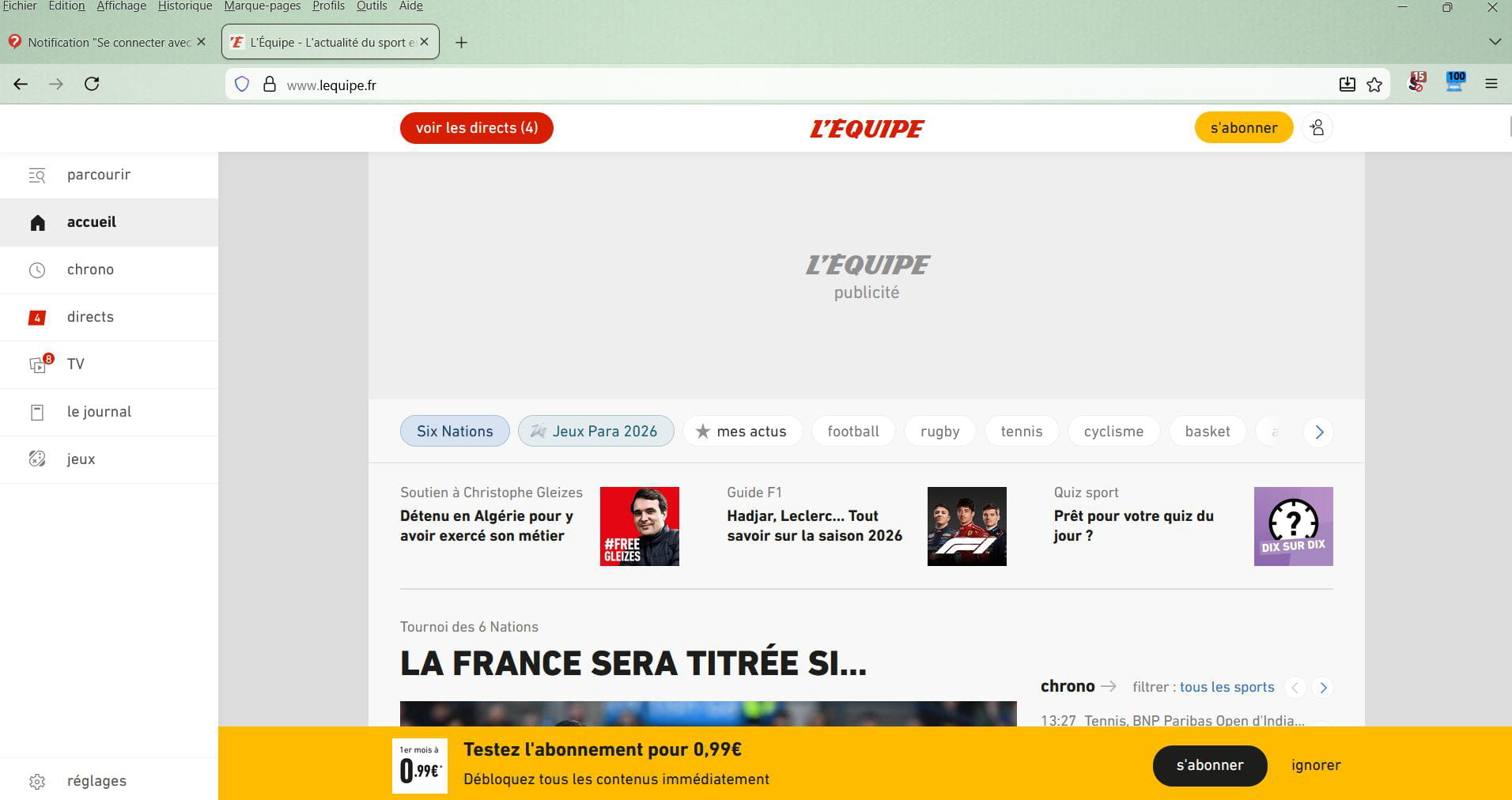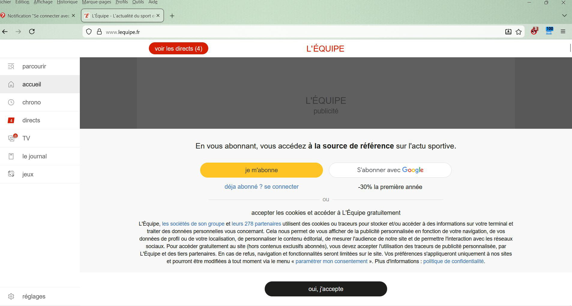 Autorisons le seul script l'équipe, il en reste de mémoire 13 autres dont google, on peut naviguer sur le site sans le fameux placard si et seulement si on n'autorise pas google, dans le meilleur des cas le fonctionnement de Chrome sans ne va être que partiel.