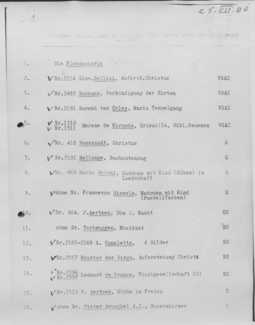Le texte manuscrit que vous mentionnez se trouve sur la première ligne, après "Die Flohsucherin". Il semble écrit au crayon léger. D'après les formes, on peut lire : "Doubtful" ou "Dubious" (en anglais) ou un mot allemand comme "Dubiose". Cependant, la phrase dactylographiée au-dessus de la liste (très effacée) semble dire : "Folgende Bilder sind am 25. VII. 1940..." (Les tableaux suivants ont été [transférés/saisis] le 25. VII. 1940).