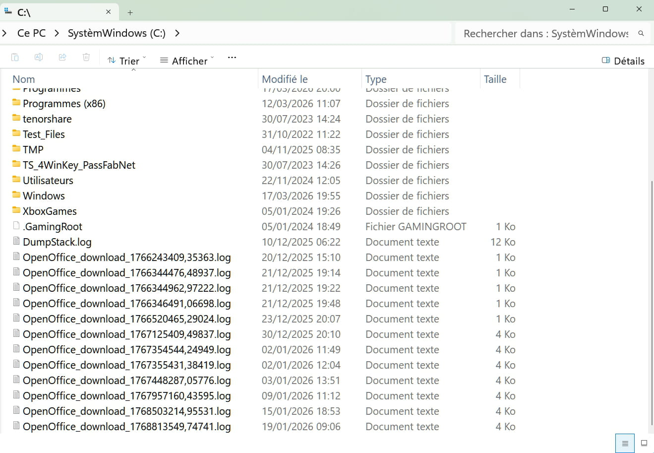 Ce matin, dans la racine du C:, je remarque 13 documents .log dont la majorité d'OpenOffice qui parle de download, cela m'étonne car la dernière mise à jour d'OpenOffice que j'ai faite c'est vendredi dernier le 13 mars, et je ne vois même pas de .log à cette date. (Voyez-vous même sur la copie d'écran)