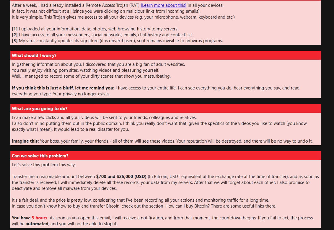Ce que tu décris correspond très probablement à une arnaque classique (chantage/sextorsion), et non à un vrai piratage. Ces messages sont envoyés en masse avec des textes alarmants pour faire peur, mais dans la plupart des cas il n’y a aucun logiciel installé sur ton PC ni aucune vidéo.