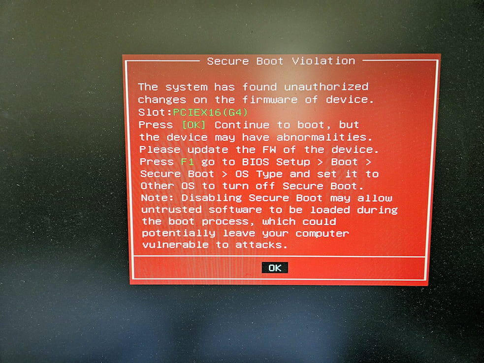Le message d'erreur indique que le système a trouvé "unauthorized changes on the firmware of the device PCIEX16(G4)", qui devrait être ma carte graphique RTX-5070, que je n'ai évidemment jamais modifié.