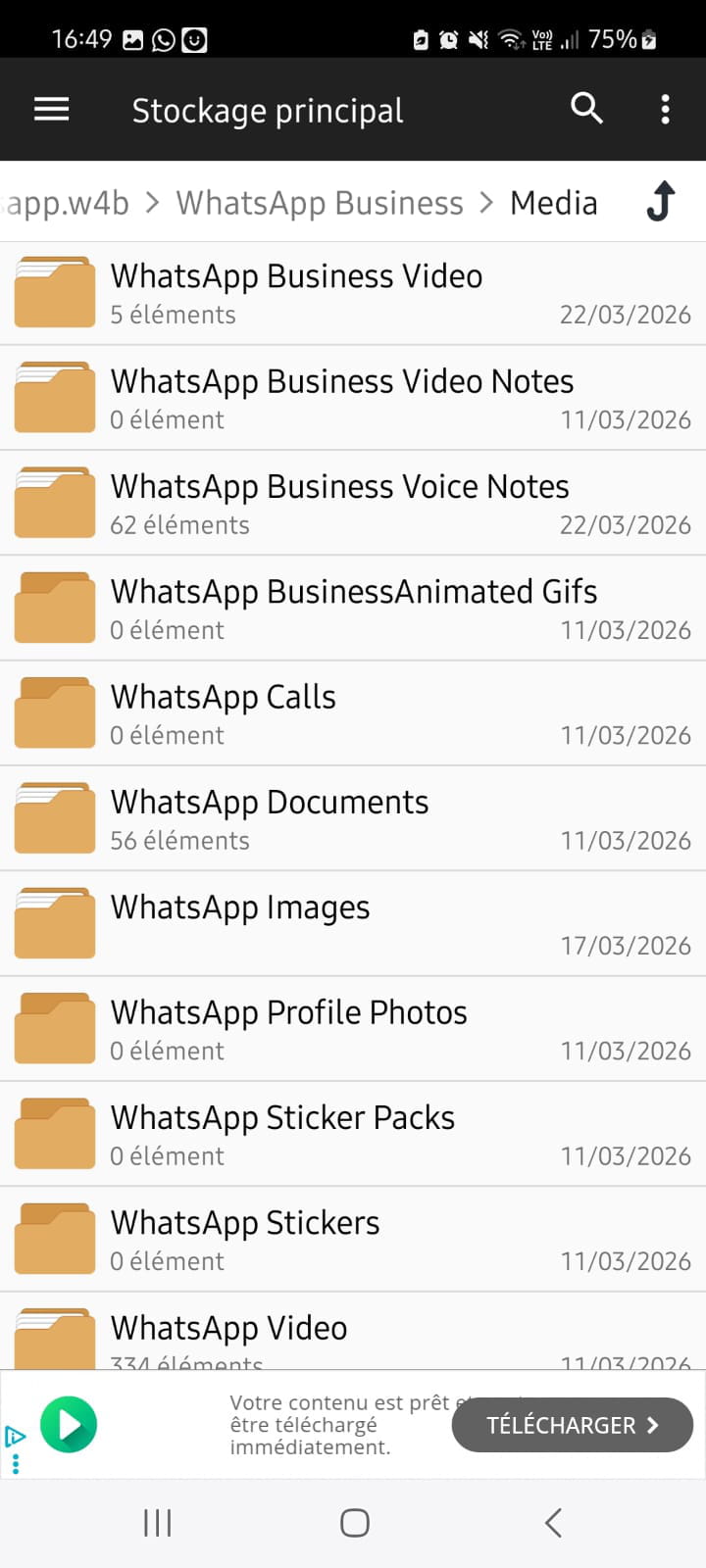 Je vous joins des captures de l’état des dossiers WhatsApp pour illustrer le désordre.