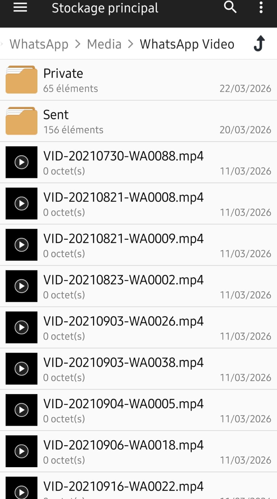 - Beaucoup de photos et vidéos apparaissent avec une taille de 0 octet, impossible de les ouvrir ou même de savoir à quoi elles correspondent.