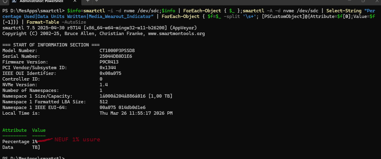 $info=smartctl -i -d nvme /dev/sdc;$info | ForEach-Object { $_ };smartctl -A -d nvme /dev/sdc | Select-String "Percentage Used|Data Units Written|Media_Wearout_Indicator" | ForEach-Object { $f=$_ -split '\s+'; [PSCustomObject]@{Attribute=$f[0];Value=$f[-1]}} | Format-Table -AutoSize