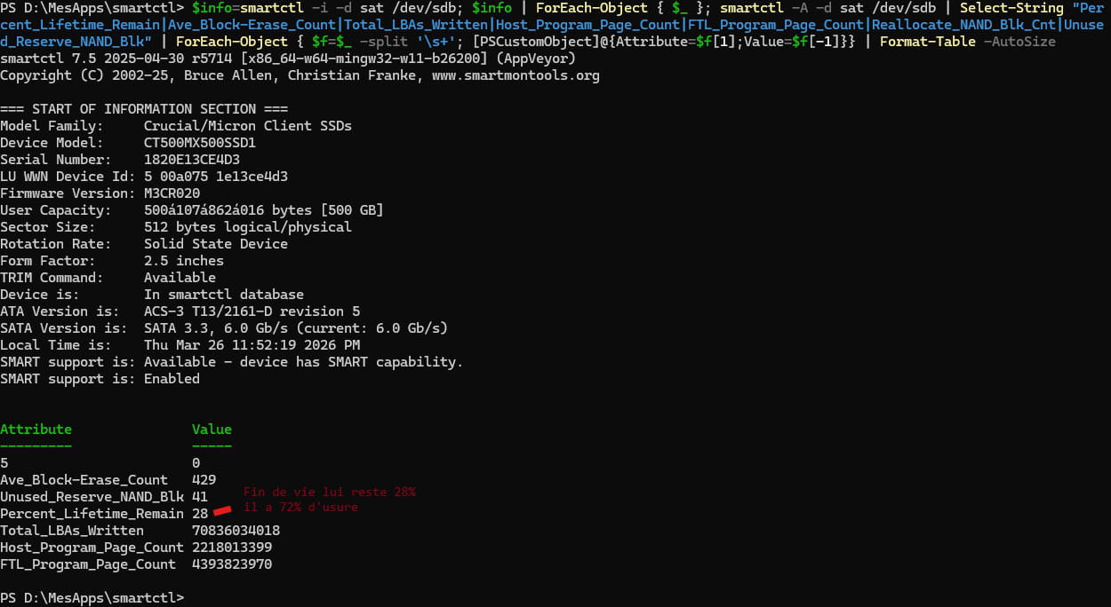 $info=smartctl -i -d sat /dev/sde;$info | ForEach-Object { $_ }; smartctl -A -d sat /dev/sde | Select-String "Percent_Lifetime_Remain|Ave_Block-Erase_Count|Total_LBAs_Written|Host_Program_Page_Count|FTL_Program_Page_Count|Reallocate_NAND_Blk_Cnt|Unused_Reserve_NAND_Blk" | ForEach-Object { $f=$_ -split '\s+'; [PSCustomObject]@{Attribute=$f[1];Value=$f[-1]}} | Format-Table -AutoSize