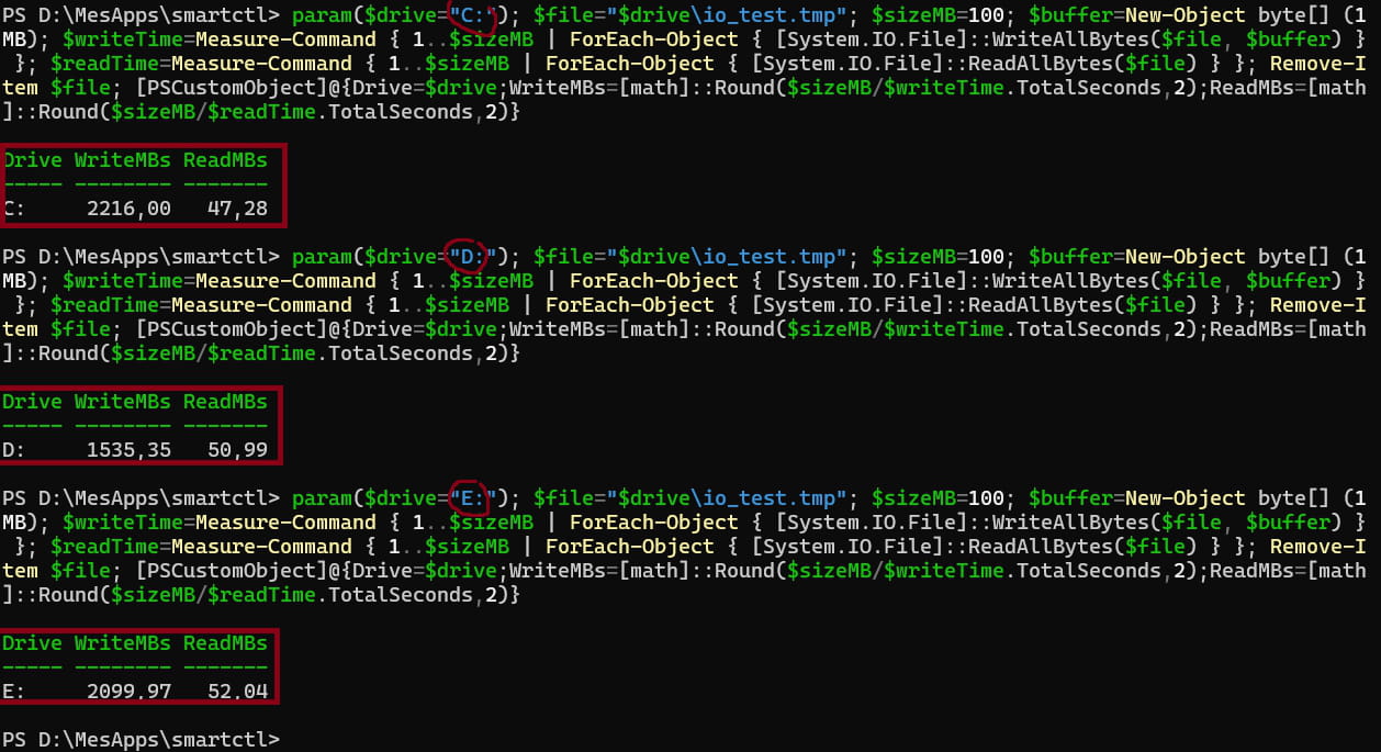 param($drive="C:"); $file="$drive\io_test.tmp"; $sizeMB=100; $buffer=New-Object byte[] (1MB); $writeTime=Measure-Command { 1..$sizeMB | ForEach-Object { [System.IO.File]::WriteAllBytes($file, $buffer) } }; $readTime=Measure-Command { 1..$sizeMB | ForEach-Object { [System.IO.File]::ReadAllBytes($file) } }; Remove-Item $file; [PSCustomObject]@{Drive=$drive;WriteMBs=[math]::Round($sizeMB/$writeTime.TotalSeconds,2);ReadMBs=[math]::Round($sizeMB/$readTime.TotalSeconds,2)}