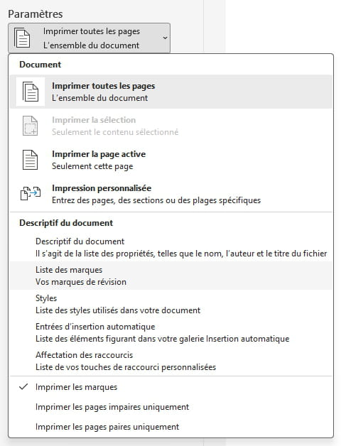 A voir si cela vous aide https://support.microsoft.com/fr-fr/office/imprimer-un-document-dans-word-591022c4-53e3-4242-95b5-58ca393ba0ee