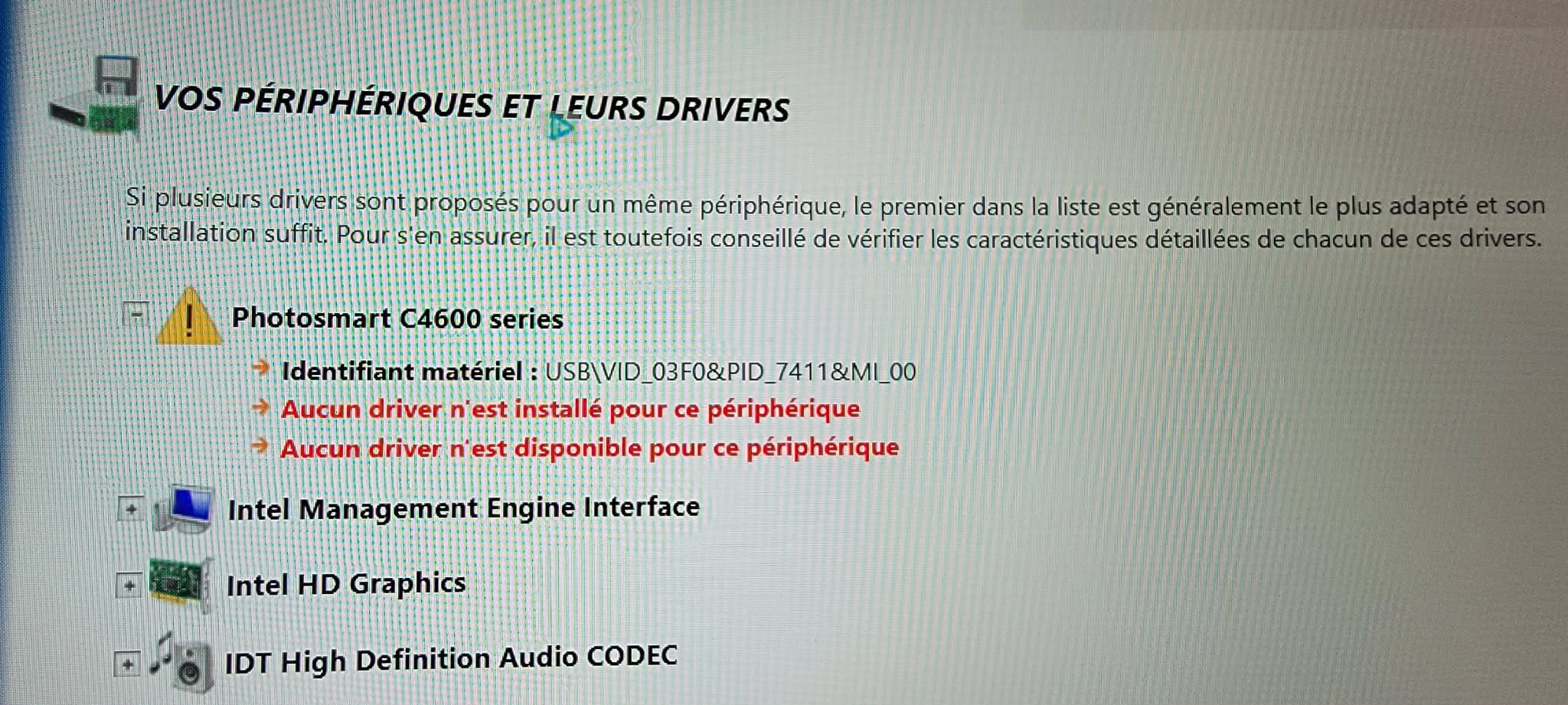 Mon imprimante HP Photosmart C4680 est reliée par cable USB à mon PC de bureau qui fonctionne sous Windows 10,mais depuis une réinstalation impossible de trouver un pilote pour la faire fonctionner.J'ai bien éssayé avec Windows Update de trouver un pilote,mais rien! Idem sur le site"Mes drivers.com" Si vous avez une solution à mon problème,merci d'avance.