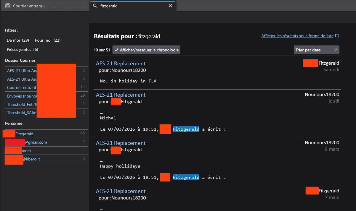 J'utilise Thunderbird 140.9.0esr, et quand je cherche un message en indiquant par exemple le nom du destinataire dans le champ de recherche, il trouve bien évidemment tous les messages contenant ce nom.